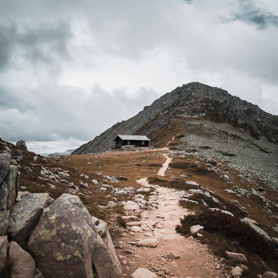 alpine, boulders, cabin, clouds, grass, hiking path, landscape, mountains, nature, outdoors, overcast sky, peak, ridge, rocky trail, scenery, slope, steep terrain, stone path, wilderness, wooden hut, mountain hut
