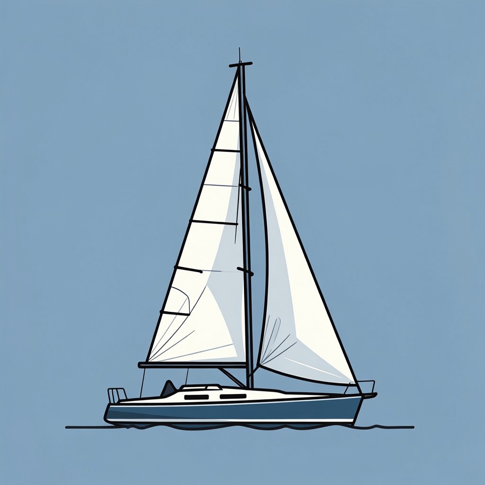 A simple line drawing illustration of a sailboat on blue water. The boat features a tall white mainsail and jib against a light blue background. It has a dark blue hull and is depicted from a side view.