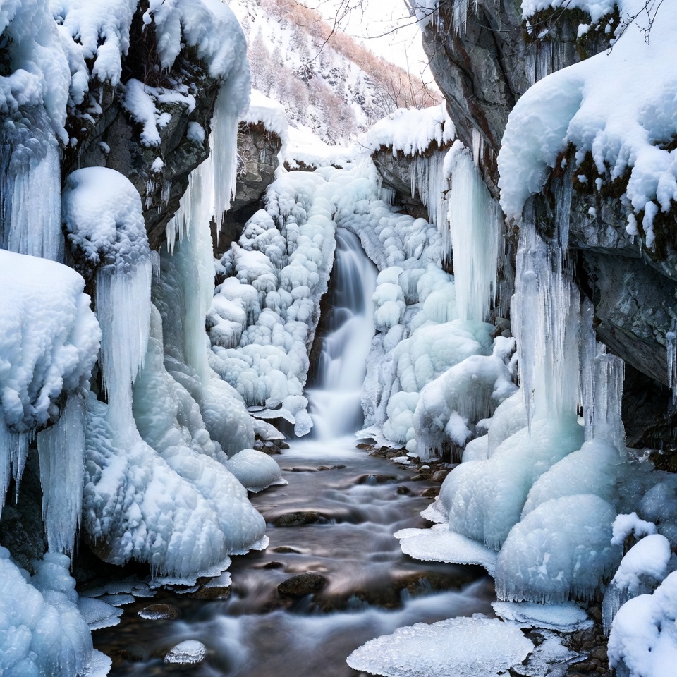 flowing stream, frozen river, frozen stream, glacial ice, heavy snow, ice cave, ice formations, ice walls, icicles, icy canyon, mountain canyon, rocks, snow, snowy gorge, snowy rocks, waterfall icicles, winter landscape, winter nature, winter scenery, frozen waterfall