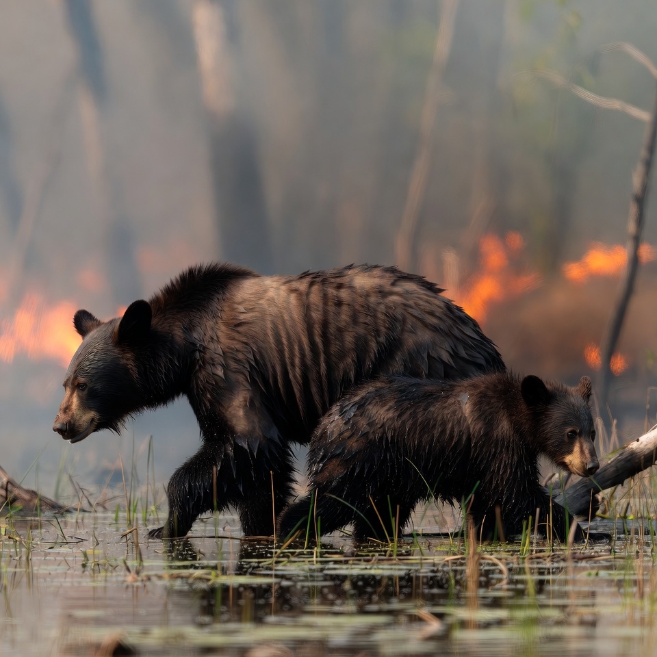 A mother black bear walks through shallow water with her cub during a forest wildfire. Flames and smoke rise in the blurred background amid trees. Wet fur covers their bodies as they move near grass and logs.
