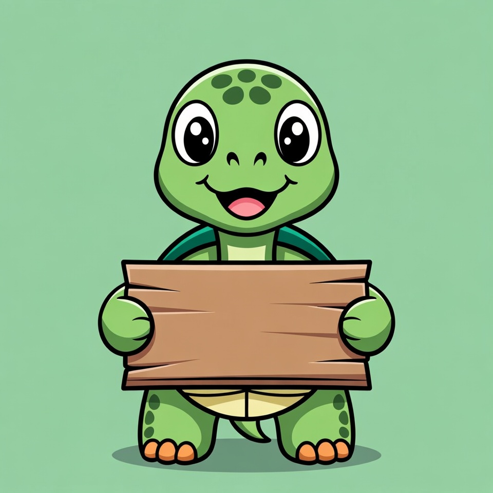 animal character, baby turtle, big eyes, blank sign, cartoon turtle, clipart, cute turtle, green turtle, happy face, holding sign, illustration, isolated background, kawaii, sign board, smiling turtle, wooden sign, turtle