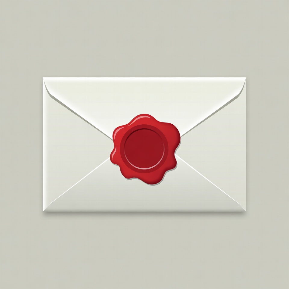 A white envelope with a flap is sealed by a prominent red wax seal in the center. The wax seal features a circular embossed design on a light gray background. The illustration has a clean, vector art style.