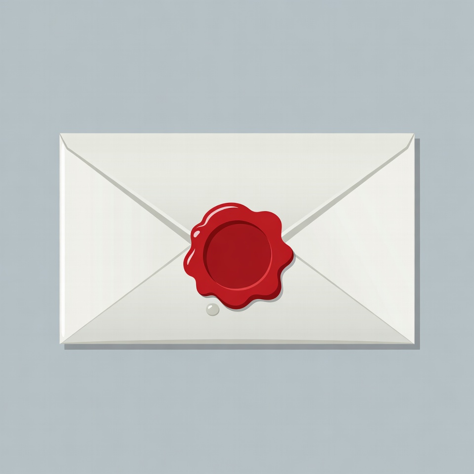 A white envelope sealed with a red wax stamp sits on a gray background. The wax seal is prominently centered on the envelope's flap. The design is a clean vector illustration.
