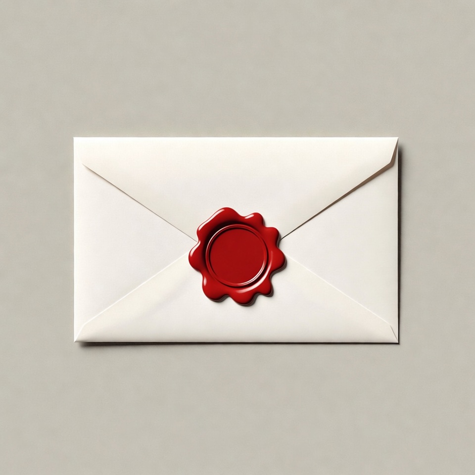 A white envelope lies flat on a gray background with its flap slightly open. A prominent red wax seal is centered on the flap, featuring a textured circular design. The seal appears freshly applied with subtle drips.
