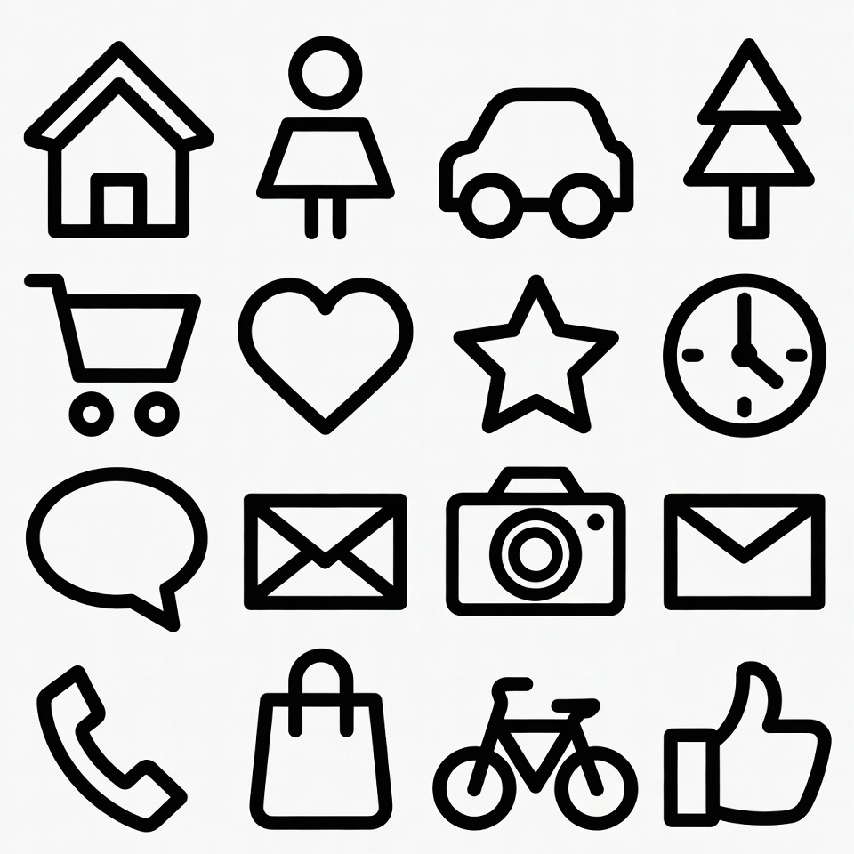 Christmas tree, bicycle icon, camera icon, car icon, clipart, clock icon, envelope icon, female, handbag icon, heart icon, house icon, icon set, illustration, isolated background, outline icons, phone icon, shopping cart, speech bubble, star icon, symbols, thumbs up, vector icons, woman, line icons
