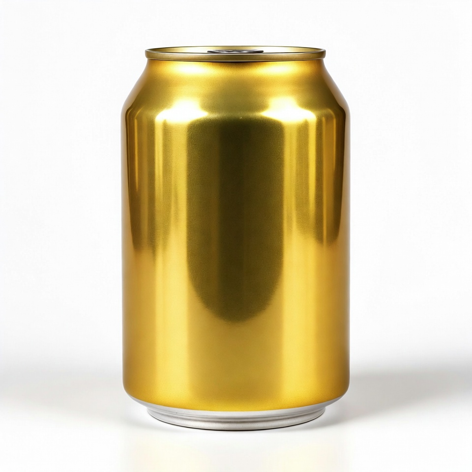 aluminum can, beverage can, energy drink, glossy finish, isolated background, metallic gold, product photography, shiny metal, soda can, tall can, white background, gold can