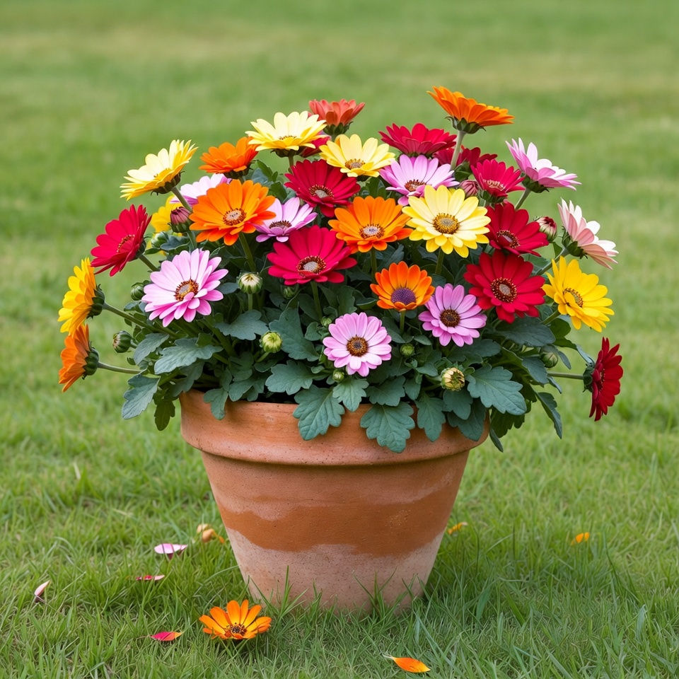 Colorful Daisies in Terracotta Pot on Grass