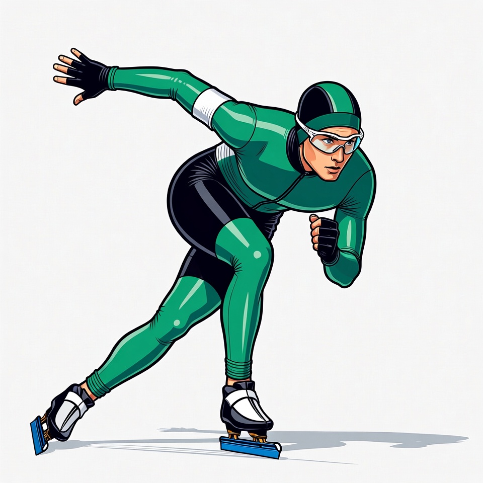 A cartoon illustration of a speed skater in a shiny green bodysuit with black accents leans forward in motion. The athlete wears a matching green helmet and goggles, black gloves, and white speed skates with blades on an isolated white background. The figure is captured mid-stride, emphasizing dynamic skating action.