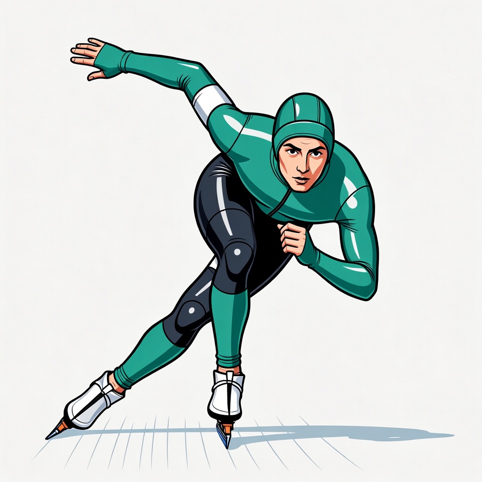 athlete, cartoon, clipart, dynamic pose, green suit, helmet, ice skates, illustration, isolated background, male, man, racing pose, shiny bodysuit, skating action, speed skating, sport, sports illustration, vector art, winter sport, speed skater