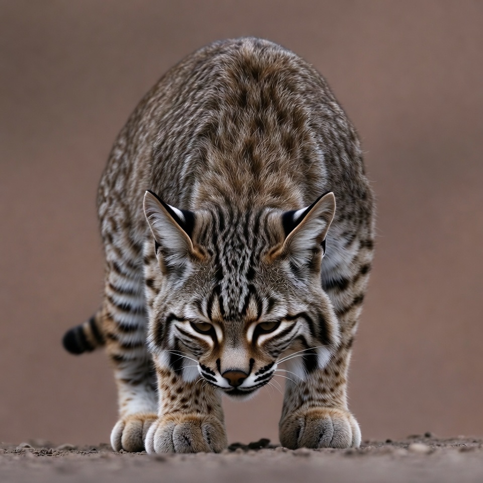 A bobcat with brown fur and black stripes crouches low on a sandy brown ground. Its yellow eyes stare intently forward, ears perked up, and tail slightly raised. The cat's paws are visible, gripping the textured dirt surface.