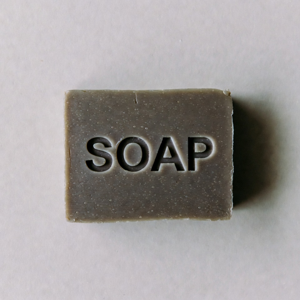 SOAP text, bar soap, bath soap, embossed soap, gray soap, handmade soap, hygiene product, isolated background, matte soap, natural soap, rectangular soap, soap bar, top view, white background, soap