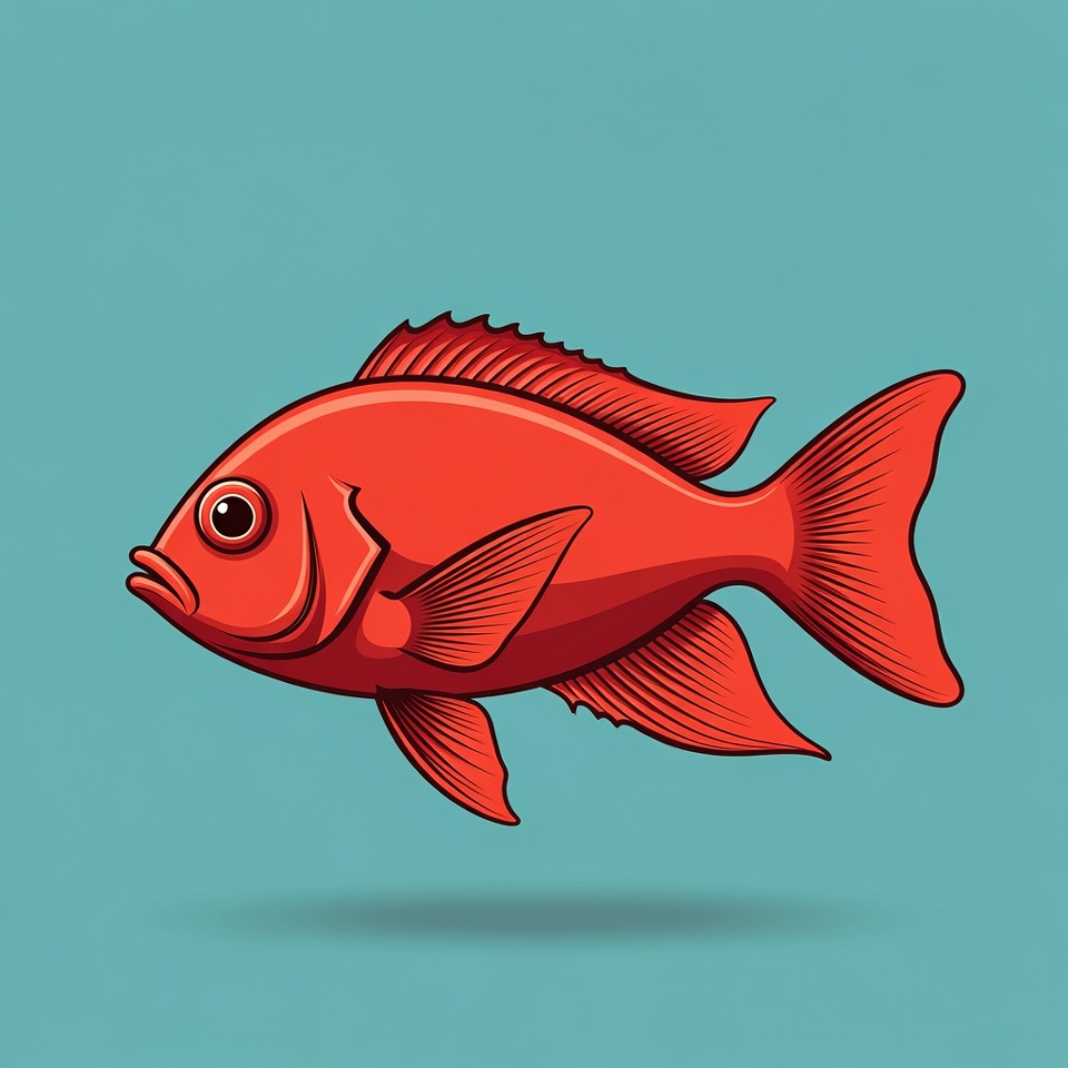 A vibrant red snapper fish with detailed fins and expressive eyes swims against a light blue background. The vector illustration features bold outlines and a subtle shadow beneath the fish. It is depicted in a side profile view.