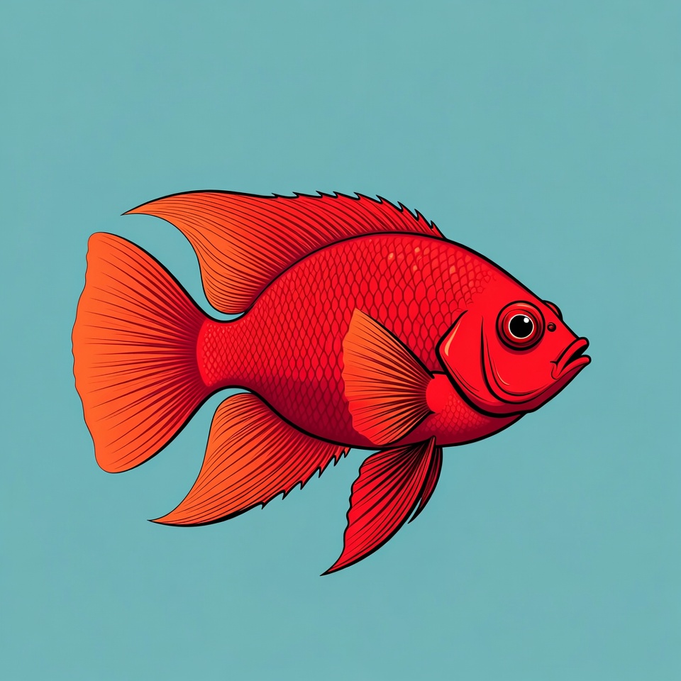 aquarium fish, blue background, cartoon fish, cichlid, clipart, fish illustration, freshwater fish, illustration, isolated background, marine life, orange fins, tropical fish, vector art, vibrant red, red fish