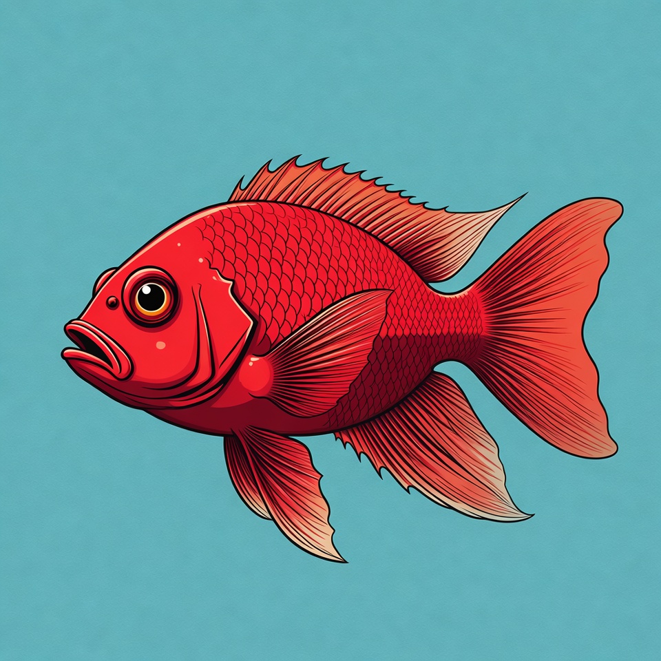 A vibrant red snapper fish with large expressive eyes and spiny fins swims against a solid blue background. The illustration features detailed scales, flowing fins in shades of red and orange, and a slightly open mouth. The style is bold vector art with smooth gradients.