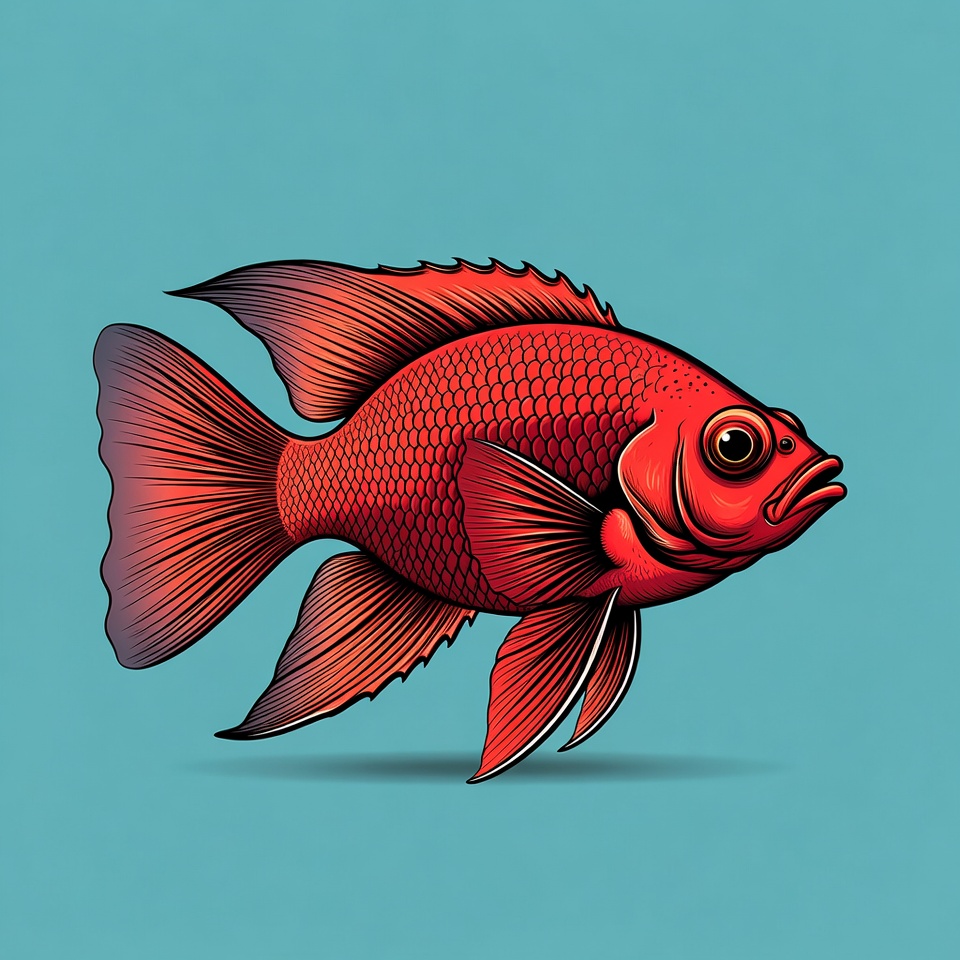 animal illustration, aquarium fish, cichlid, colorful fish, digital illustration, fins, fish illustration, freshwater fish, graphic design, illustration, isolated background, marine life, scales, tropical fish, turquoise background, vector art, vibrant red, red fish