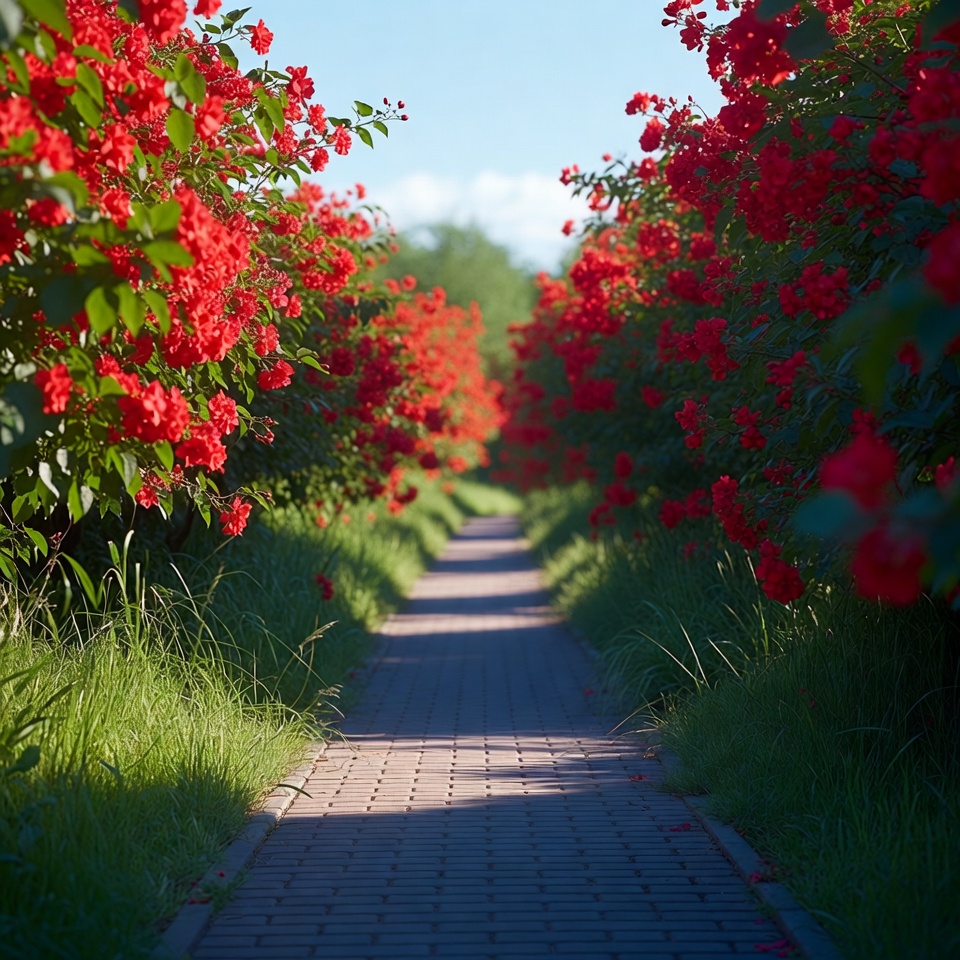A paved brick pathway lined with lush red bougainvillea bushes stretches through a green garden. Vibrant pink-red flowers bloom densely on both sides under a clear blue sky. Sunlight casts shadows on the walkway amid fresh green grass.