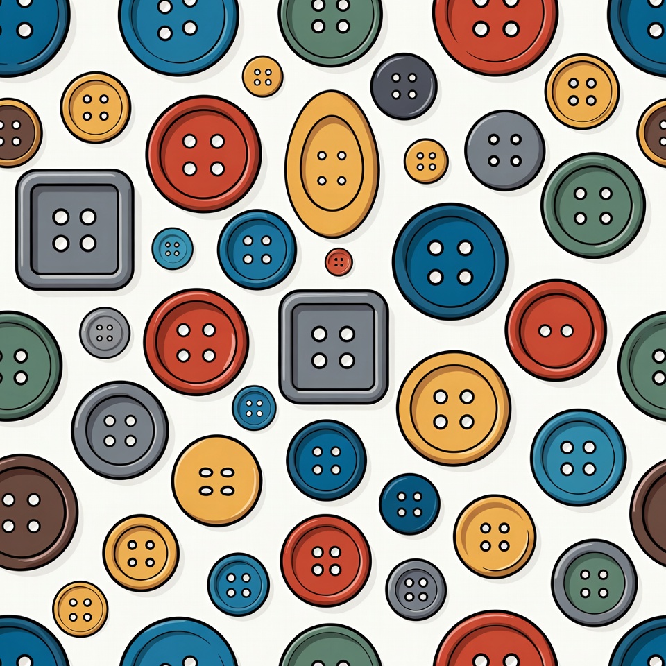 A seamless pattern features various colorful buttons scattered across a white background. The buttons come in shapes like round, oval, and square, with vibrant colors including red, blue, yellow, green, and gray. Each button has four holes for sewing.