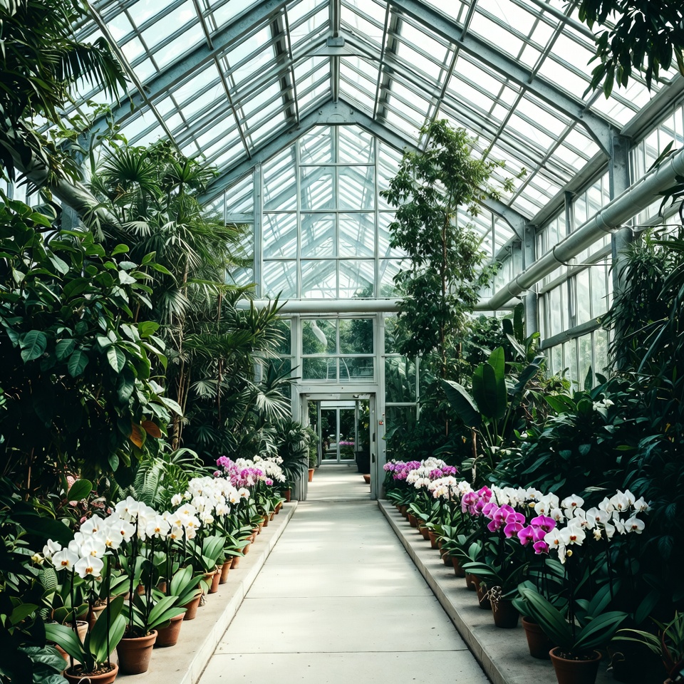 arched ceiling, botanic garden, conservatory, exotic plants, floral display, flowers, glass roof, indoor garden, lush greenery, orchids, palms, pathway, pink orchids, plants, potted plants, sunlight, terracotta pots, tropical plants, white orchids, greenhouse