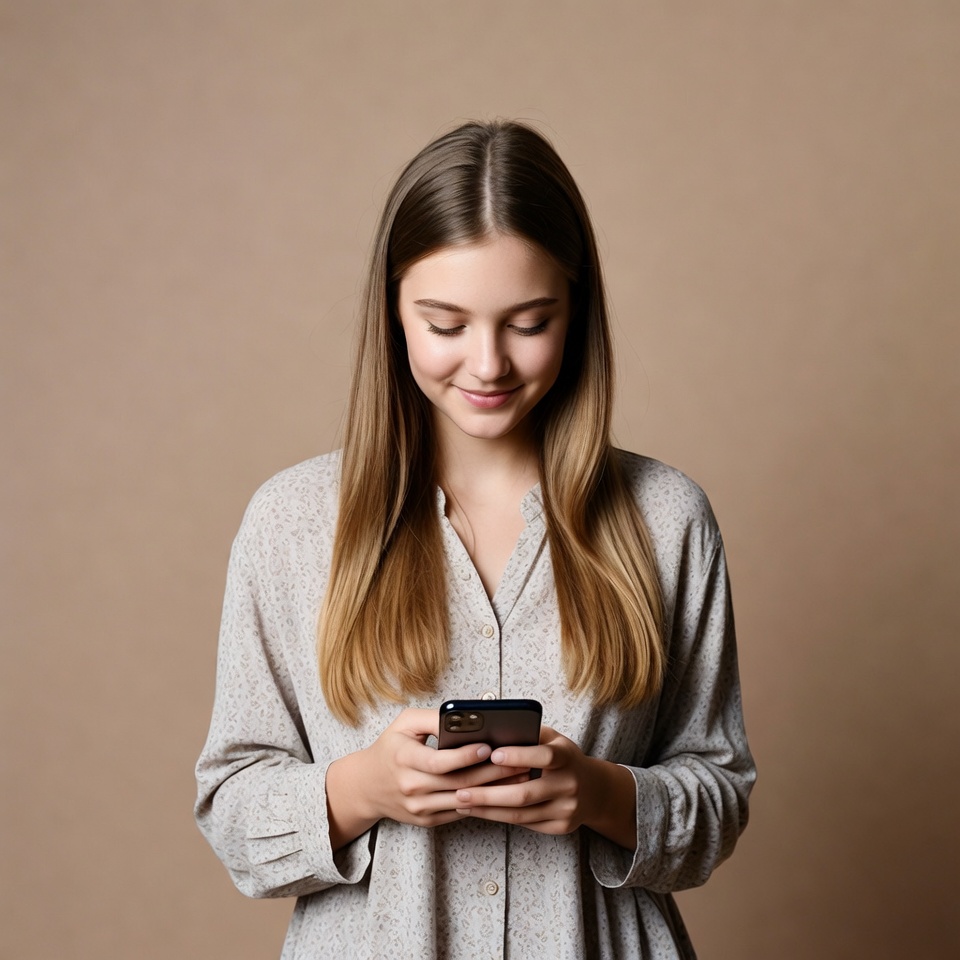 A young woman with long straight brown hair smiles while looking down at her smartphone. She wears a light gray button-up blouse with long sleeves and stands against a plain beige background. Her hands hold the black phone in front of her.