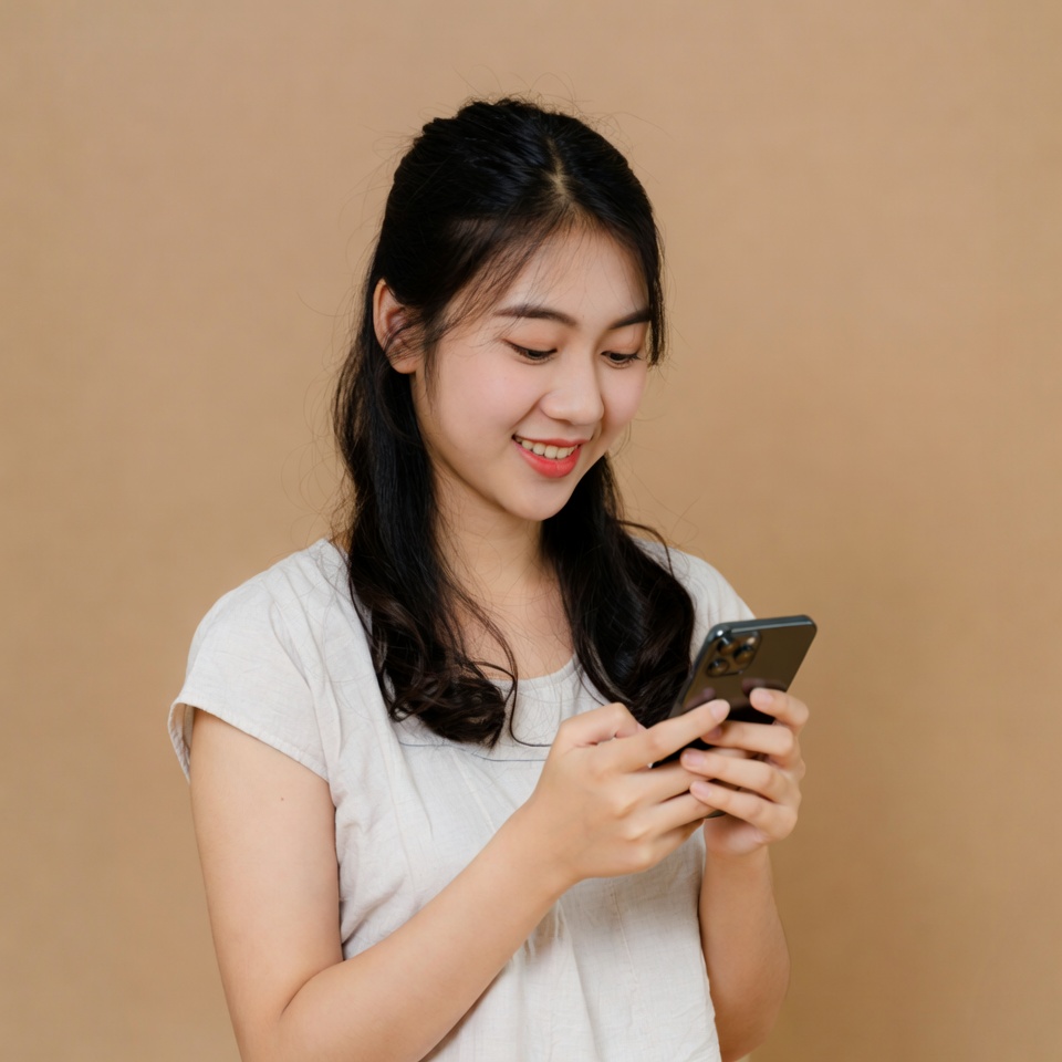 A young Asian woman with long black hair tied back smiles while looking at her smartphone. She wears a white short-sleeved top and holds the phone with both hands. The image features a plain beige background.