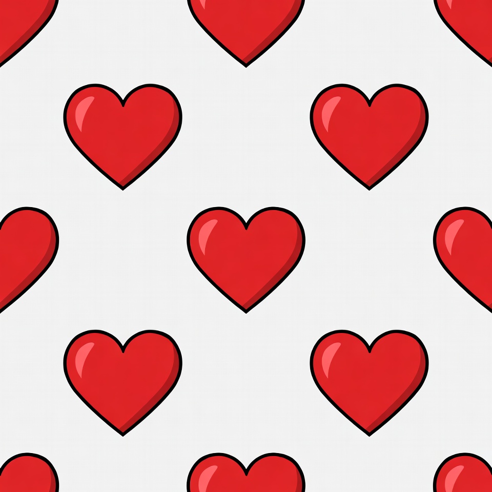 A seamless pattern features multiple identical red hearts arranged in a grid on a white background. Each heart has a glossy, cartoonish appearance with smooth outlines and shiny highlights. The repeating design creates a uniform and vibrant texture.