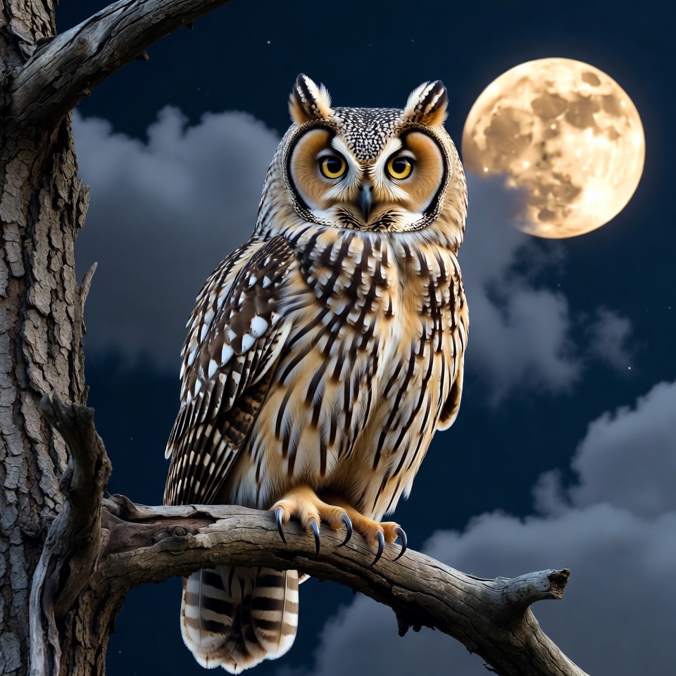 A detailed owl with brown and white feathers perches on a gnarled tree branch under a full moon. The night sky features scattered clouds, and the owl gazes forward with large yellow eyes. The scene is illuminated by soft moonlight.