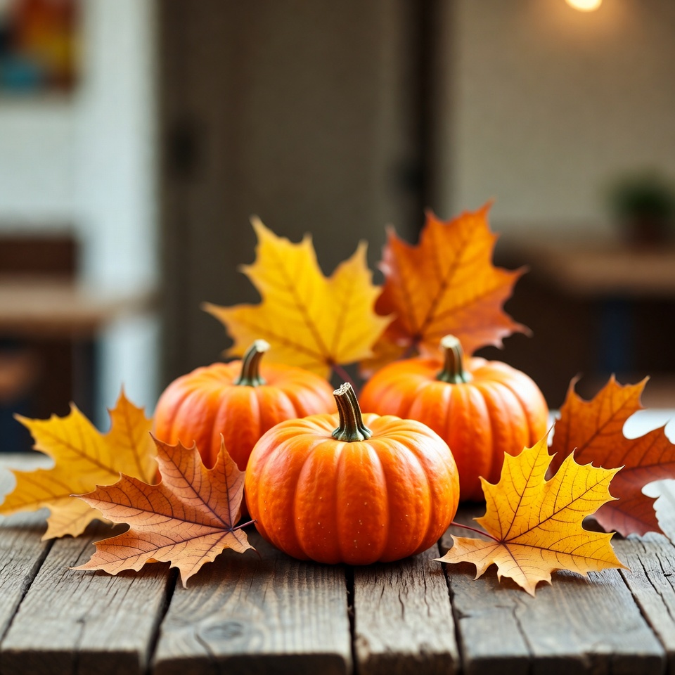 Halloween, Thanksgiving, autumn, autumn leaves, cozy background, fall decor, harvest, indoor setting, orange pumpkins, rustic wood, still life, three pumpkins, warm lighting, wooden table, yellow leaves, pumpkins