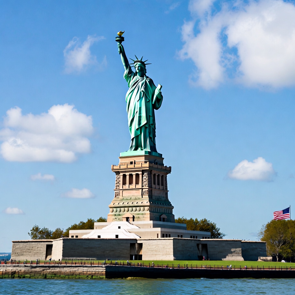 The Statue of Liberty stands tall on its pedestal in New York Harbor under a clear blue sky with scattered white clouds. The iconic green copper statue holds a torch in her right hand and a tablet in her left, with the American flag visible nearby. The scene includes the stone base, surrounding water, and autumn trees.