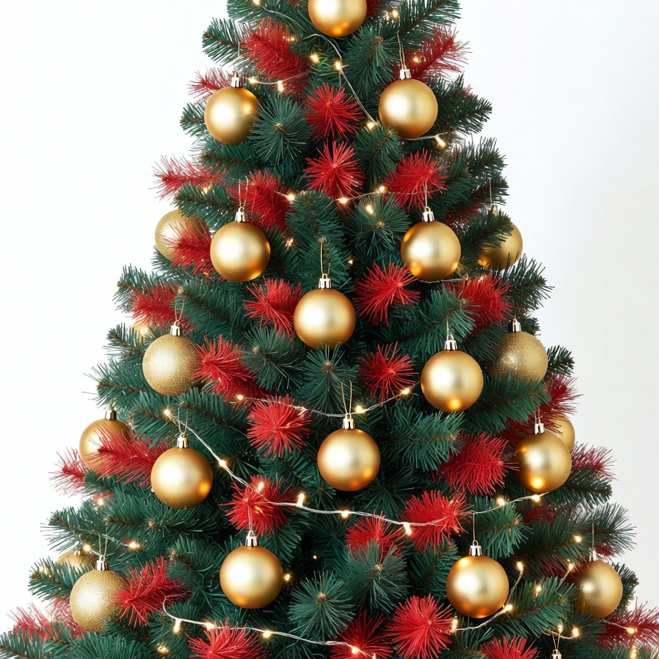 Christmas decor, artificial tree, festive tree, gold baubles, gold ornaments, green branches, holiday decoration, holiday tree, isolated background, red accents, red fuzz, shiny balls, twinkling lights, white lights, Christmas tree