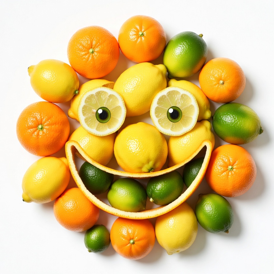 A cheerful face is creatively arranged from fresh oranges, lemons, and limes on a white background. Bright yellow lemons form the eyes with green lime details and a wide smiling mouth. Surrounding oranges create the sun-like hair around the fruit face.