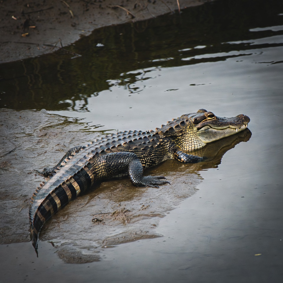 animal, crocodile, head, lying down, mud, muddy bank, nature, outdoors, reflection, reptile, resting, riverbank, scales, shallow water, swamp, tail, water, wildlife, alligator