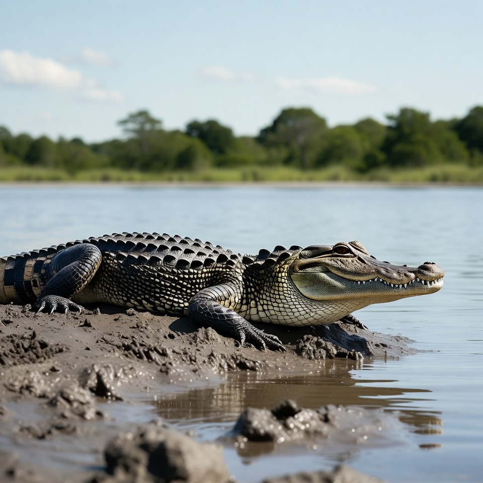 A large alligator lies on a muddy bank beside a calm river. Its scaly body and open mouth with visible teeth are prominent against the water and green trees in the background. The scene features clear skies and lush vegetation.