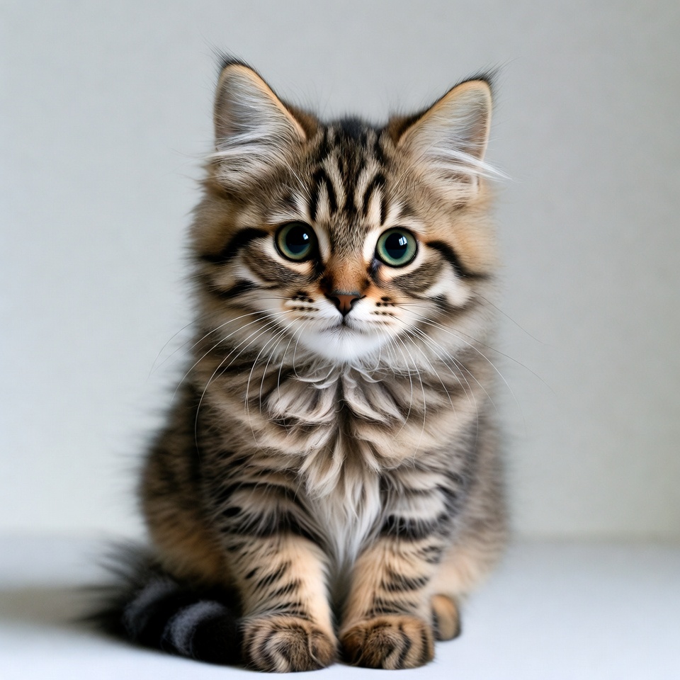 A fluffy tabby kitten with brown and black stripes sits on a white background. It has large green eyes, pointed ears, and a playful expression with whiskers extended. The kitten's fur is soft and detailed, showing its paws and striped tail.