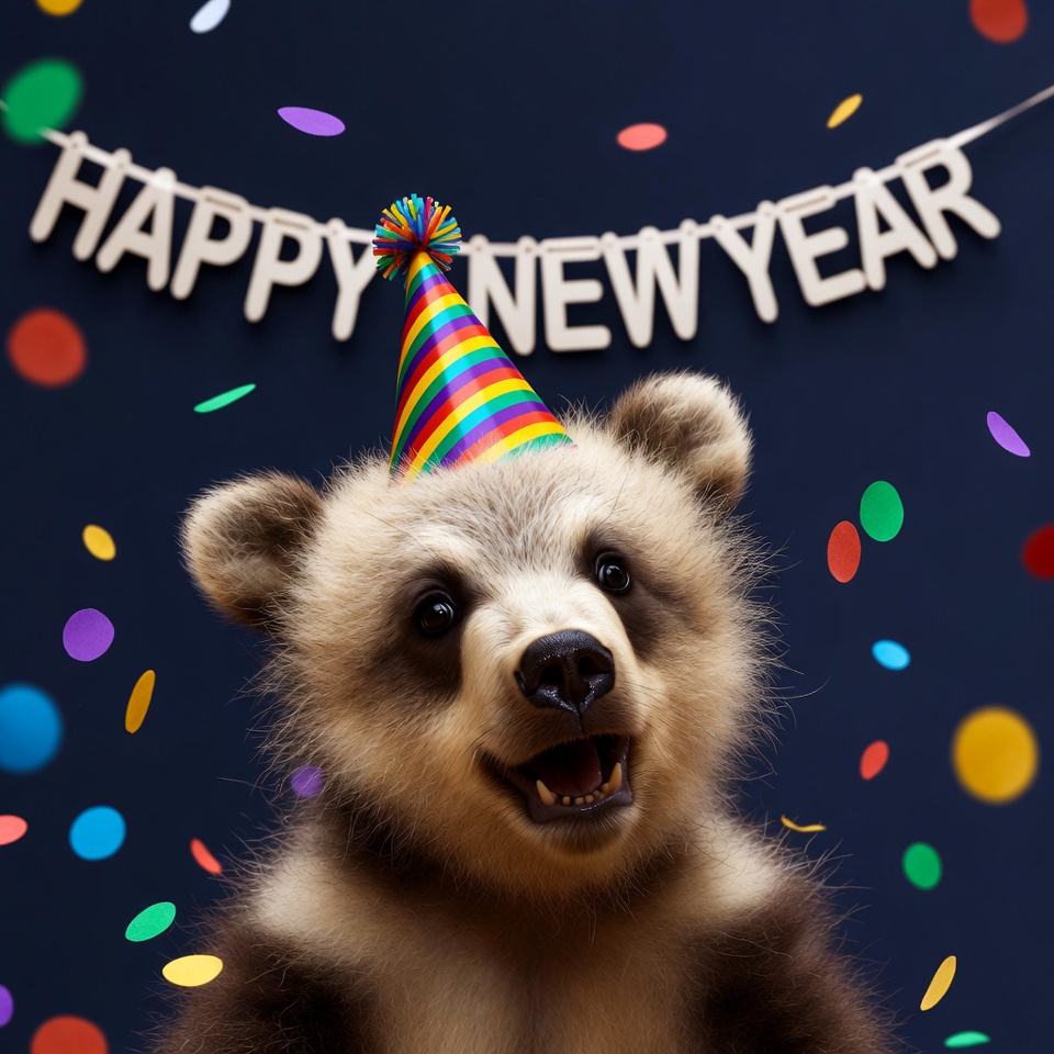 animal, baby bear, banner, celebration, colorful hat, confetti, cute animal, dark background, festive, happy new year, holiday, illustration, isolated background, new year, party hat, smiling bear, bear cub