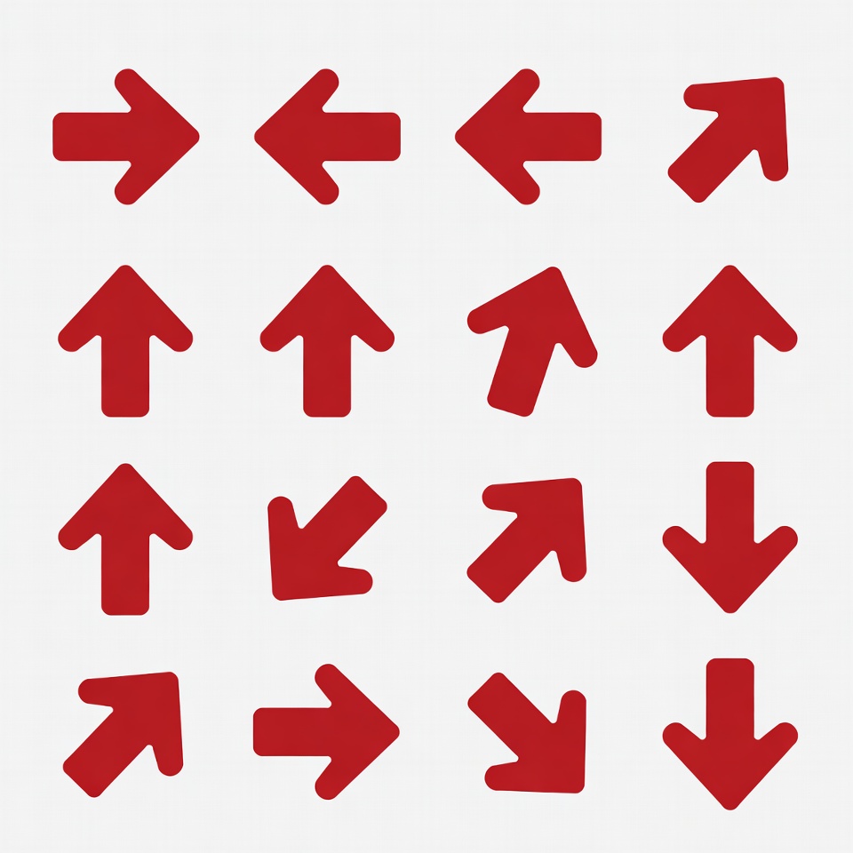 arrow icons, arrow set, bold arrows, clipart, direction symbols, down arrow, flat design, illustration, isolated background, left arrow, navigation icons, right arrow, up arrow, vector graphics, red arrows