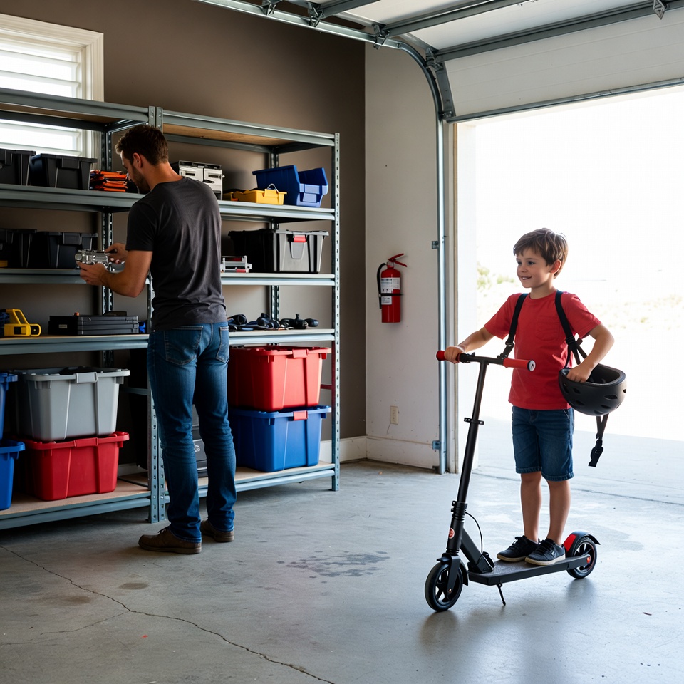 A man with short hair stands by metal shelves organizing tools and colorful storage bins in a spacious garage. A young boy wearing a red shirt, shorts, and holding a black scooter helmet stands nearby with his electric scooter. The open garage door reveals bright daylight outside.