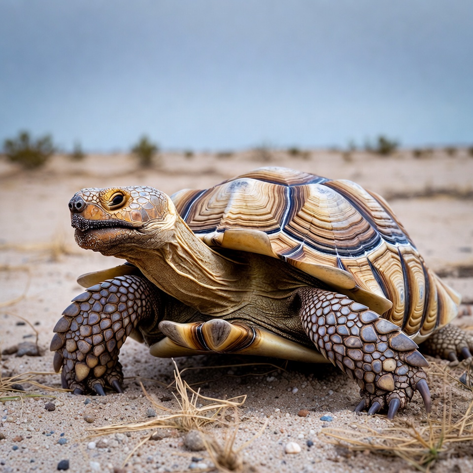 animal, brown shell, cloudy sky, desert, eyes, grass, head, isolated background, legs, radiated tortoise, reptile, sandy ground, shell, turtle, wildlife, yellow patterns, tortoise