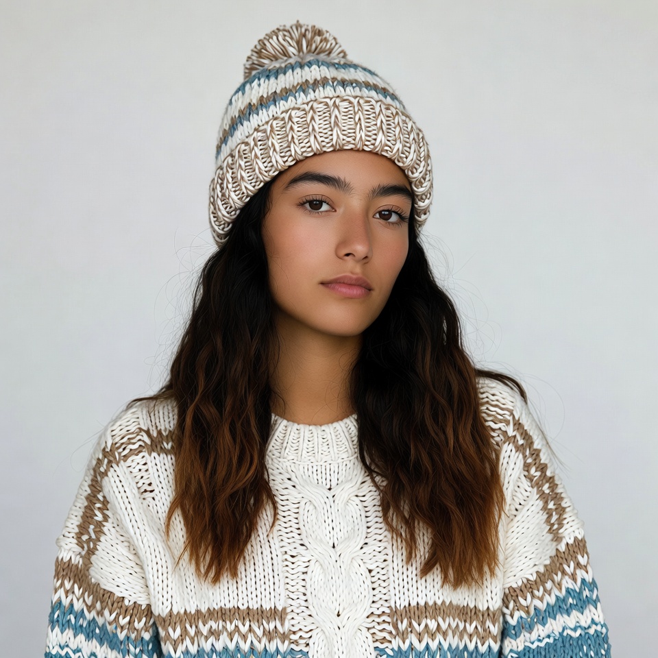 A young woman with long wavy brown hair wears a cream and blue striped knit beanie hat. She has a neutral expression and is dressed in a matching cream knit sweater with brown and blue stripes. The image is isolated on a plain white background.