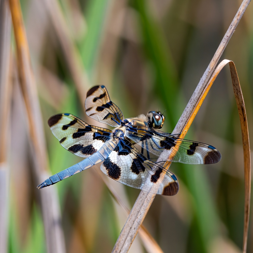 A dragonfly with spotted wings and a blue tail perches on a tall grass stem. Its wings feature black and white patterns, and its body shows green eyes and intricate markings. The background consists of blurred green reeds.