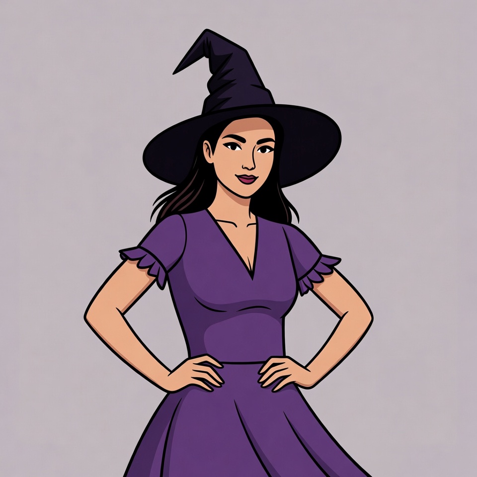 Asian, Halloween, animated character, black hat, cartoon, clipart, confident pose, costume, dark hair, female, hands on hips, illustration, isolated background, long hair, purple dress, ruffled sleeves, v-neck dress, witch hat, woman, witch