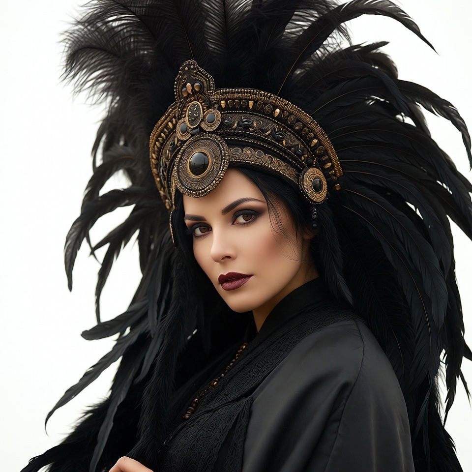 A woman with long dark hair and striking makeup wears an elaborate black feather headdress adorned with gold and black metallic elements on a white background. She has dark lipstick and gazes directly at the camera. She is dressed in a black fringed outfit.