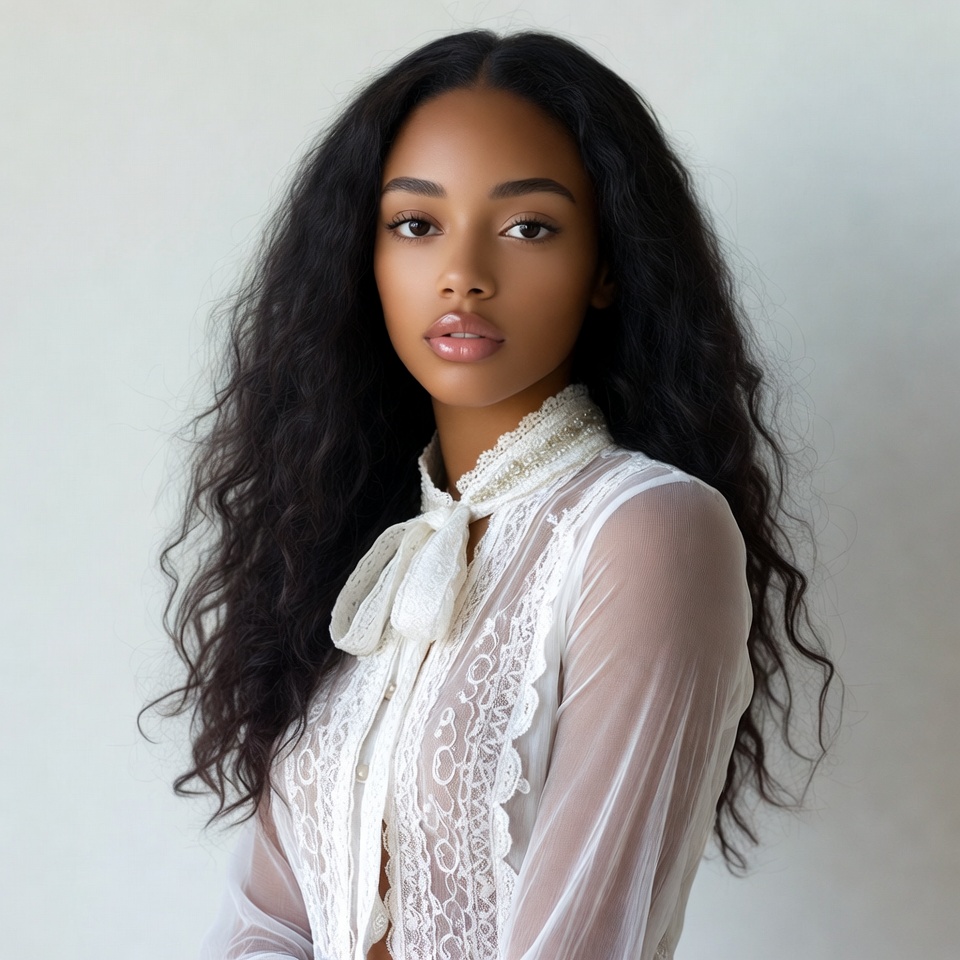 A young African-American woman with long wavy black hair gazes at the camera. She wears a sheer white lace blouse with a bow collar and delicate embroidery. She stands against a plain white background.