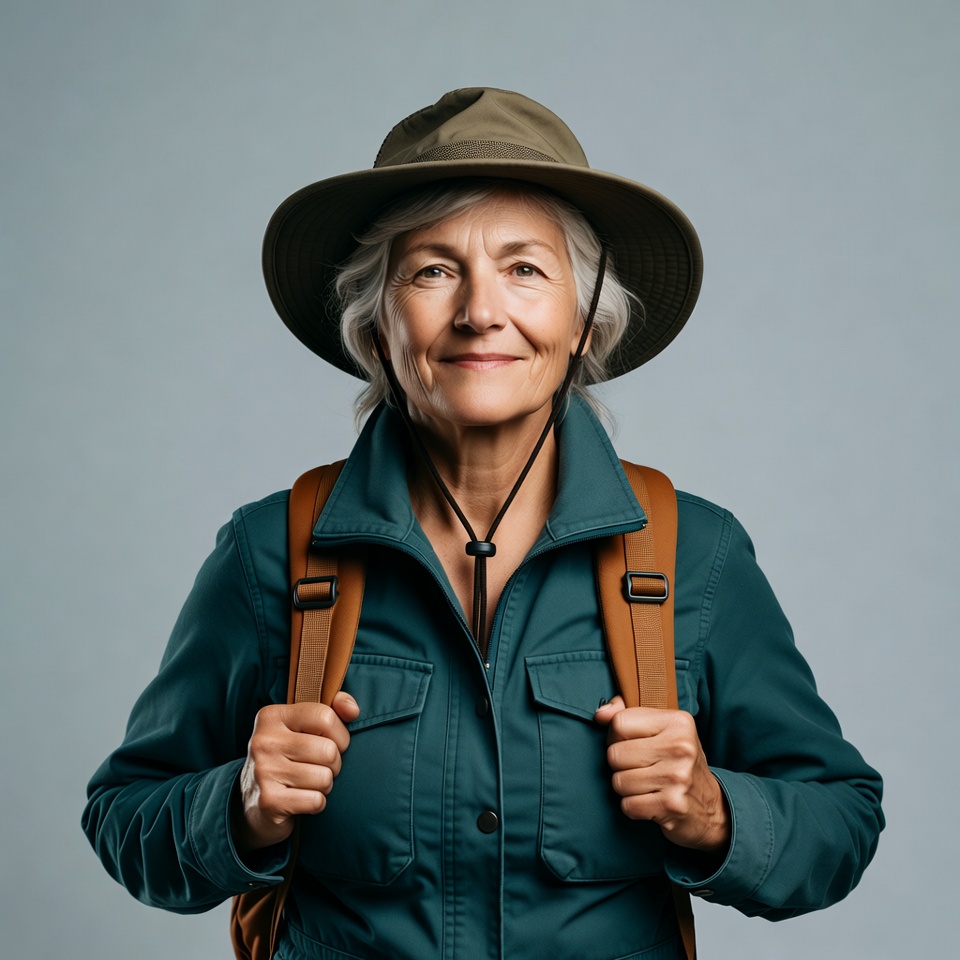 White, adventure gear, brown backpack, elderly woman, fedora hat, front view, gray hair, green jacket, happy expression, isolated background, khaki hat, outdoor clothing, portrait, senior woman, smiling, teal jacket, wide-brim hat, woman