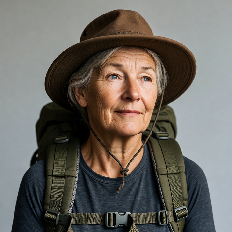 An elderly White woman with short gray hair smiles at the camera while wearing a wide-brimmed brown hat. She has a green backpack on her back and wears a dark gray shirt. The image is isolated against a plain gray background.