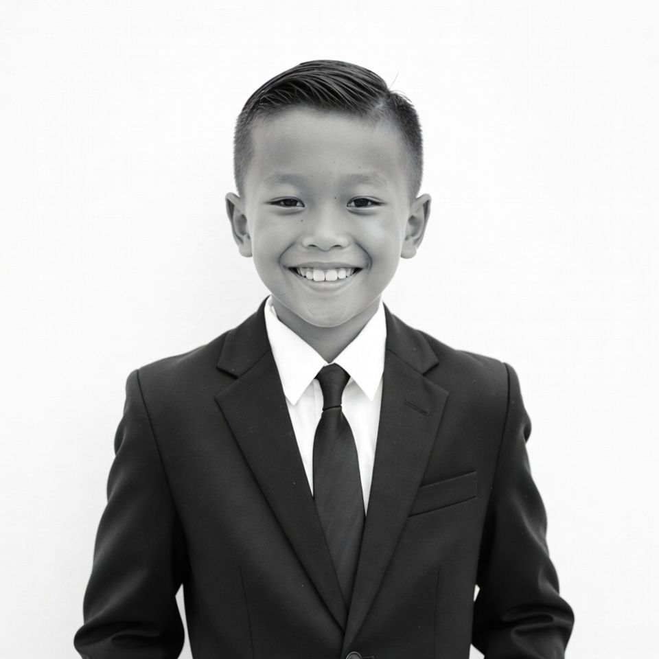 Asian, Asian boy, black and white, black suit, black tie, child, formal suit, formal wear, happy smile, headshot, isolated background, kid, male, monochrome, portrait, slicked hair, smiling boy, suit, white shirt, young boy, boy