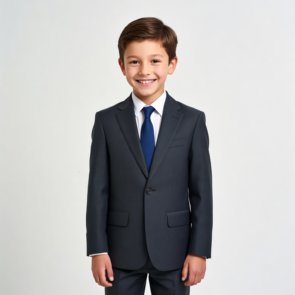 A young boy with short brown hair stands smiling against a white background. He wears a navy blue suit jacket, white dress shirt, and matching navy tie. His posture is straight with hands at his sides.