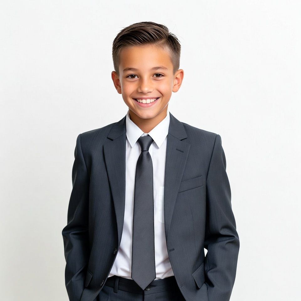 A young boy with short dark hair stands smiling confidently against a white background. He wears a dark suit jacket, white dress shirt, and black tie, with hands in his pockets. His expression is cheerful and engaging.