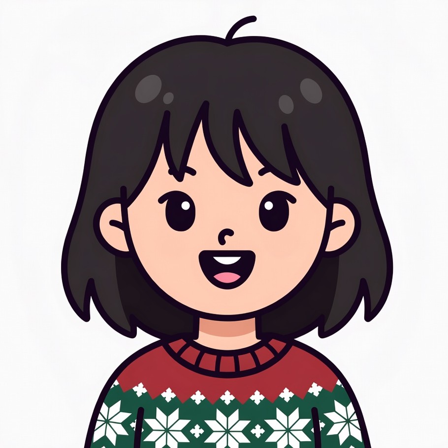 A cute cartoon girl with black bob hair smiles happily on a white background. She wears a red and green Christmas sweater with snowflake patterns and a turtleneck collar. Her large expressive eyes and wide grin give her a cheerful appearance.