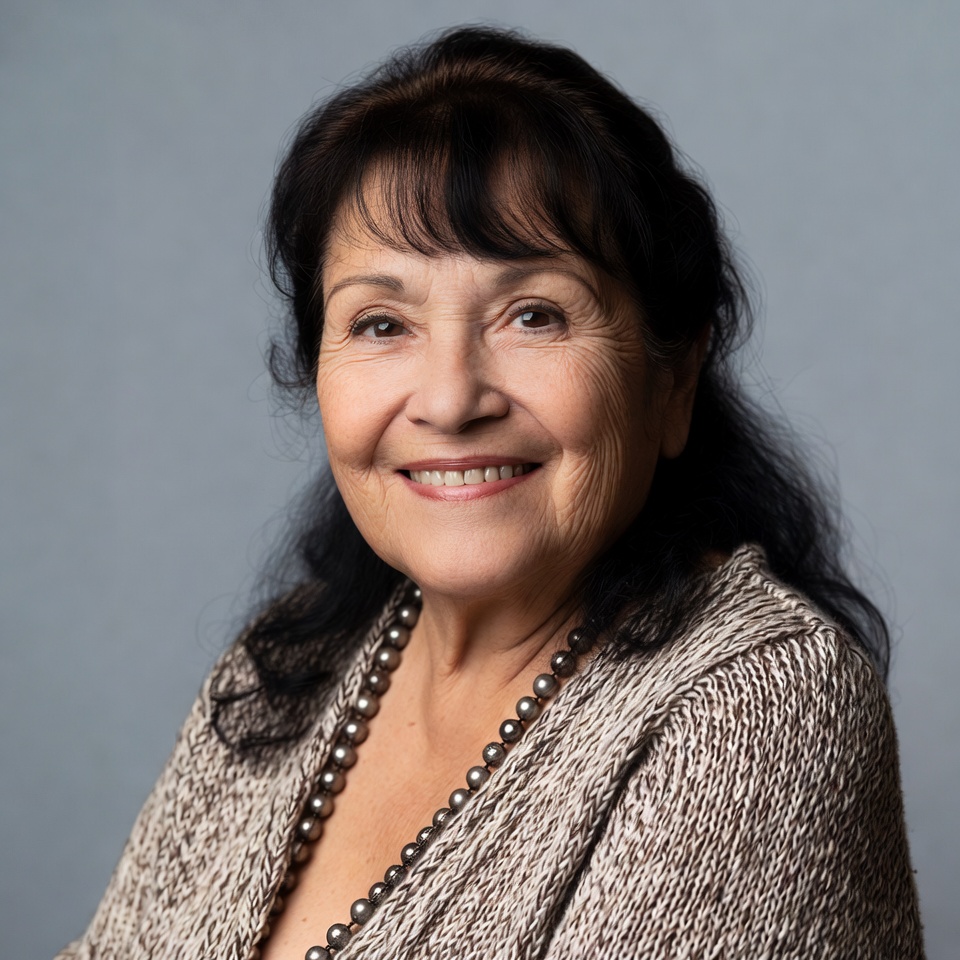 An older woman with dark wavy hair and bangs smiles warmly at the camera. She wears a light brown cardigan and a long strand of dark beads necklace. The portrait is set against a plain gray background.