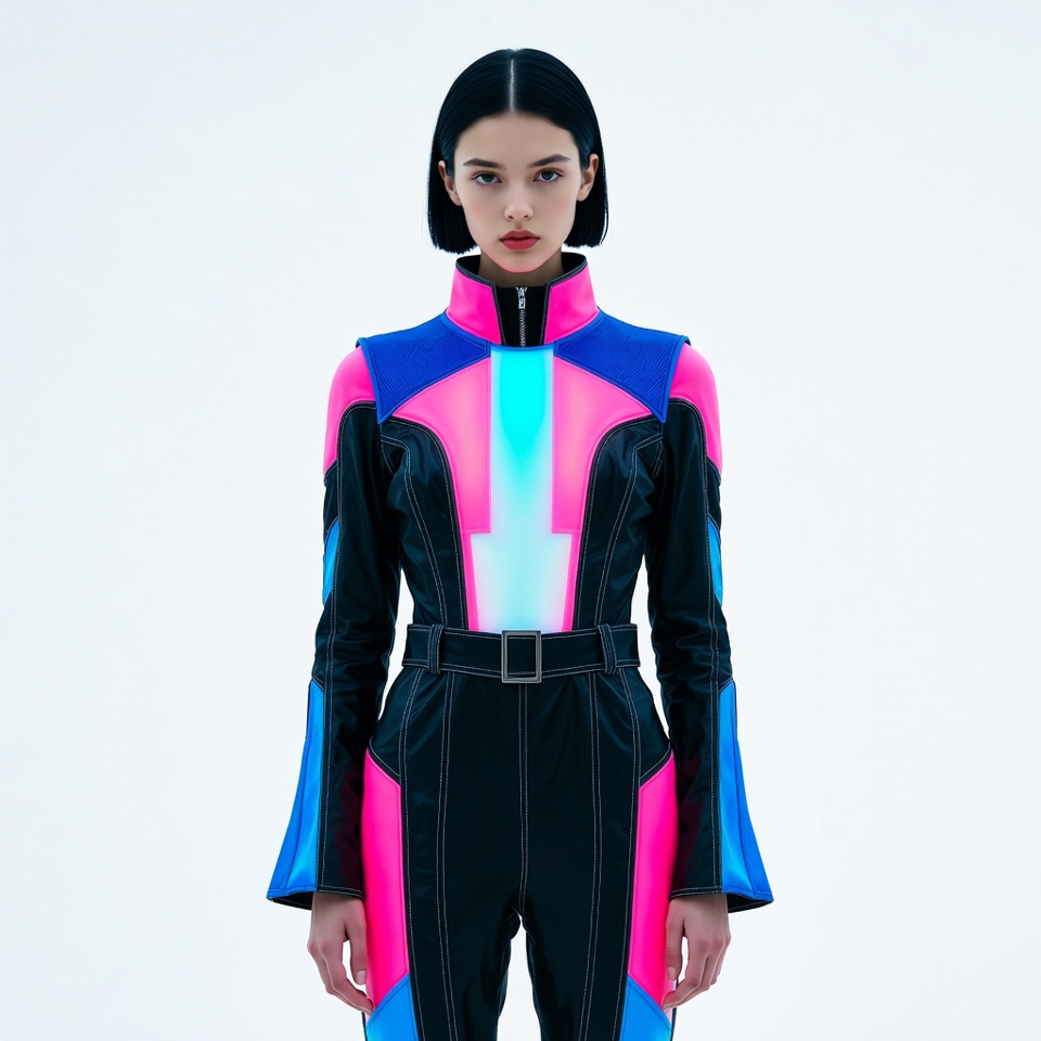 A young Asian woman with straight black bob haircut stands frontally wearing a futuristic black jumpsuit with neon pink, blue, and glowing accents. The high-collared outfit features bold geometric panels, flared sleeves, and a belt. She poses confidently against a plain white background.